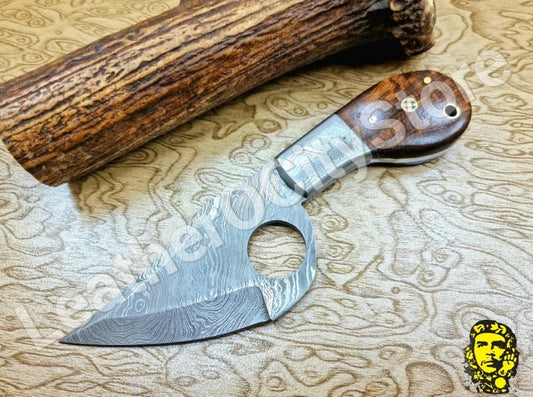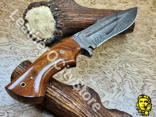 7.50 Inch Custom Handmade Damascus Steel finger hole skinning Hunting Dagger Knife- With Leather Sheath, Damascus knife, Hunting knife