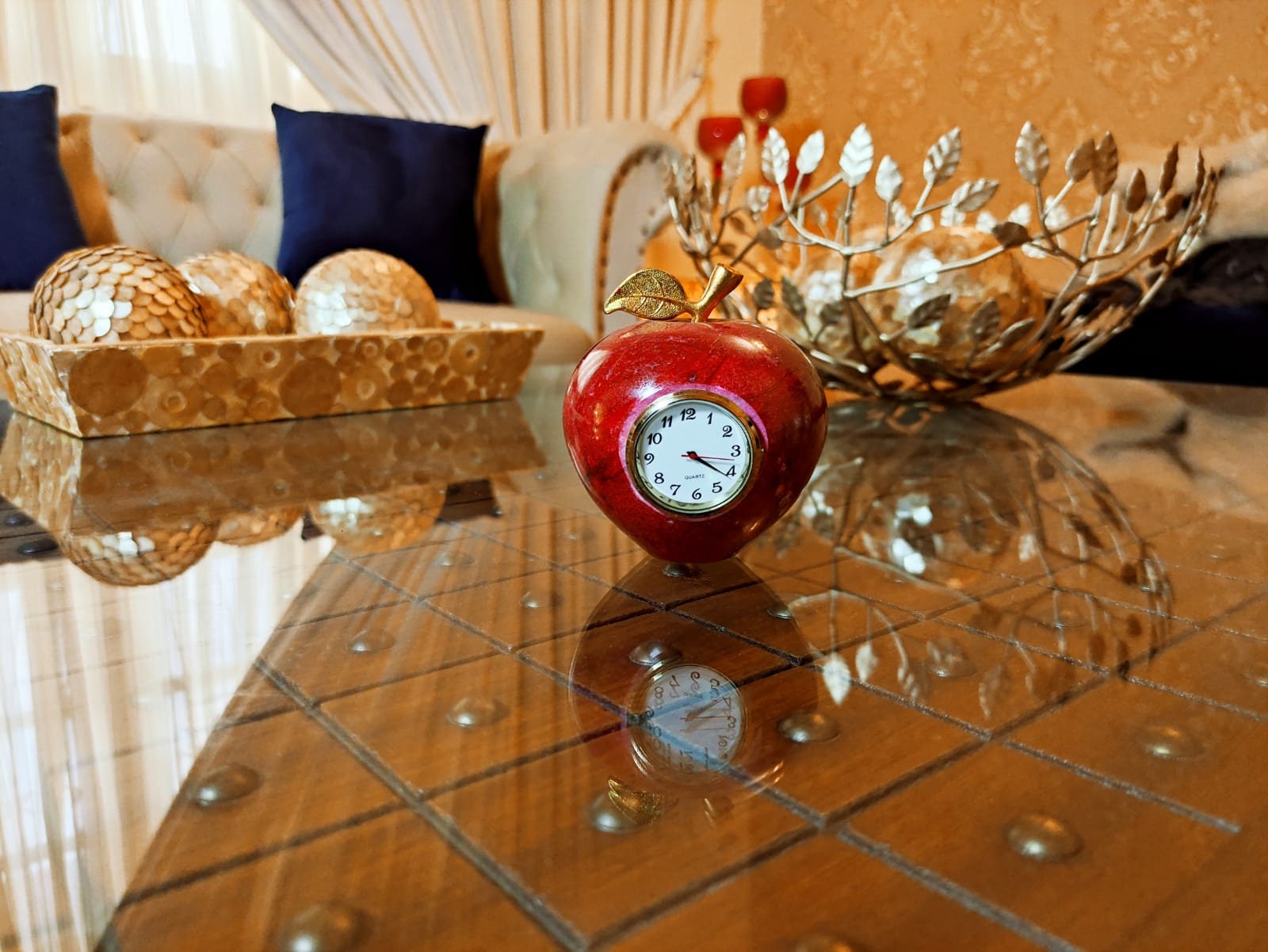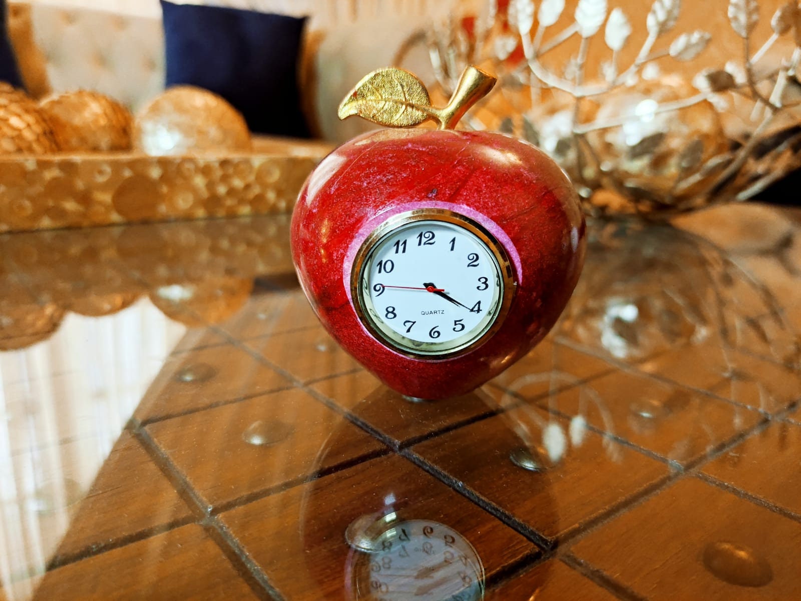 Decorative marble apples,Red apple Clock with gold colored leaves, home gifts, mom gifts Marble Paperweight Handmade Table Clock,